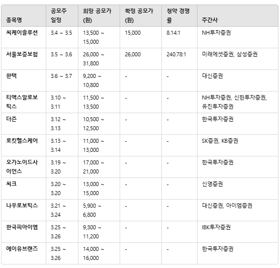2025년 3월에는 다양한 공모주가 청약을 진행하며, 특히 서울보증보험, 씨케이솔루션, 티엑스알로보틱스 등 관심을 받을 만한 종목들이 있습니다. 투자자는 청약 경쟁률, 기관 수요 예측, 업종별 성장성을 분석하여 신중하게 투자 전략을 세워야 합니다.
