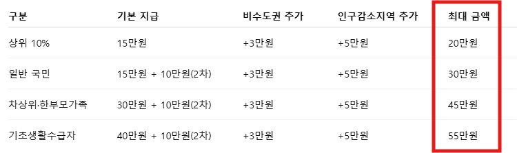 - 비수도권/인구감소지역: 추가 3만~5만 원