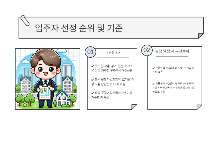 ✔ 전용면적 40㎡ 이하 주택 → 무주택 기간 + 부양가족 수 + 청약통장 가입기간 순으로 선정