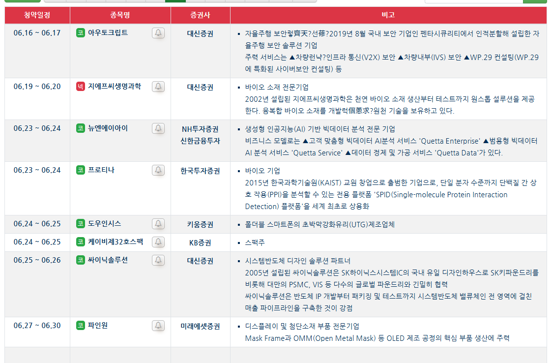 - 6월 24~25일에만 4종목 청약이 몰림 → 소액 다청약 전략 또는 선호 산업 선별 필요