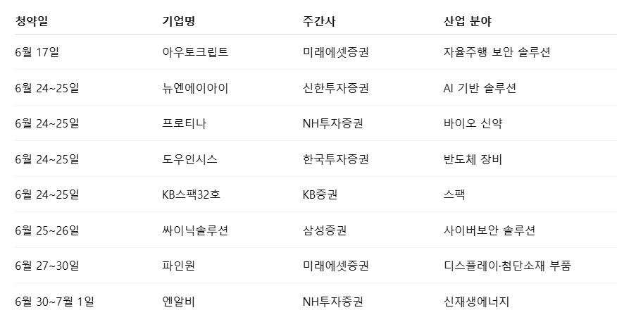 2025년 6월은 청약 수는 적지만 고성장 산업 중심의 핵심 공모주가 포진해 있습니다. 특히 AI, 반도체, 보안 같은 산업은 지속적인 테마가 살아있기 때문에, 단기 수익을 넘는 가치 기반 접근이 중요합니다.