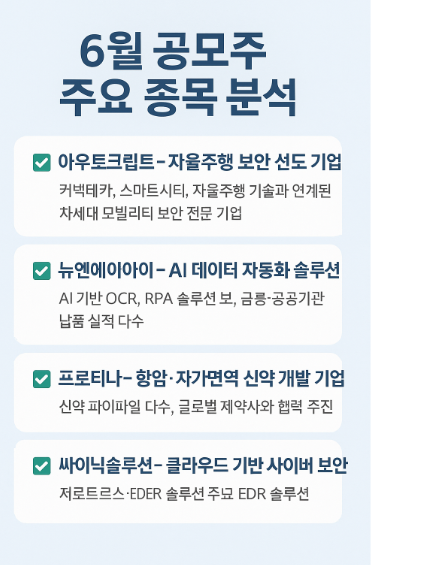2025년 6월은 공모주 시장이 다소 조용해 보일 수 있지만, 핵심 산업군 중심의 상장 예정 기업이 포함되어 있어 투자자들의 전략적인 접근이 필요한 시점입니다.