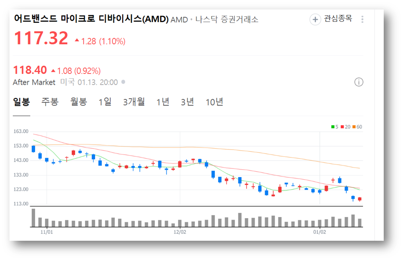 안녕하세요? 오늘은 계속되는 하락세를 맞이하고 있는 기업, AMD 주가 전망에 대해 알아보도록 하겠는데요, 기업 뉴스와 주가 현황, 그리고 보조 지표 들을 통해 알아보는 주가 전망까지 놓치지 마시고 살펴보세요!