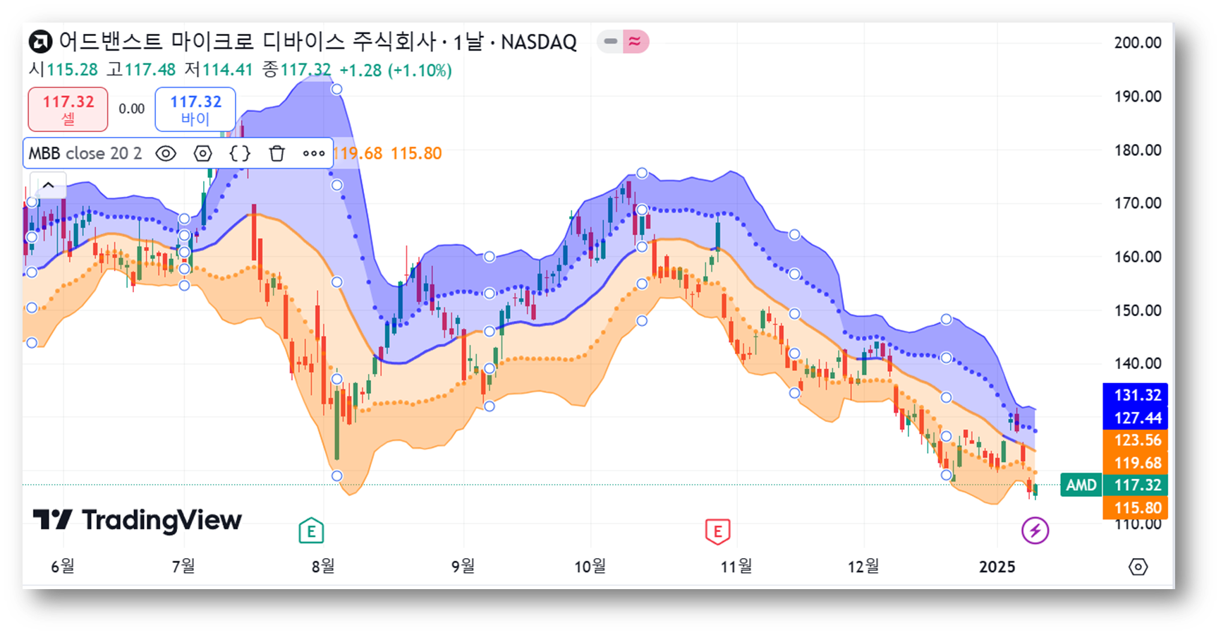 현재 주가는 하단선인 $115.80대에서 움직이고 있는데요, 지지 여부가 중요하며, 하단선을 지지하고 반등한다면 단기적 상승 가능성이 있어 보입니다. 만약 하단선을 하향 돌파한다면 추가 하락의 위험이 있으니 유의해야 합니다.