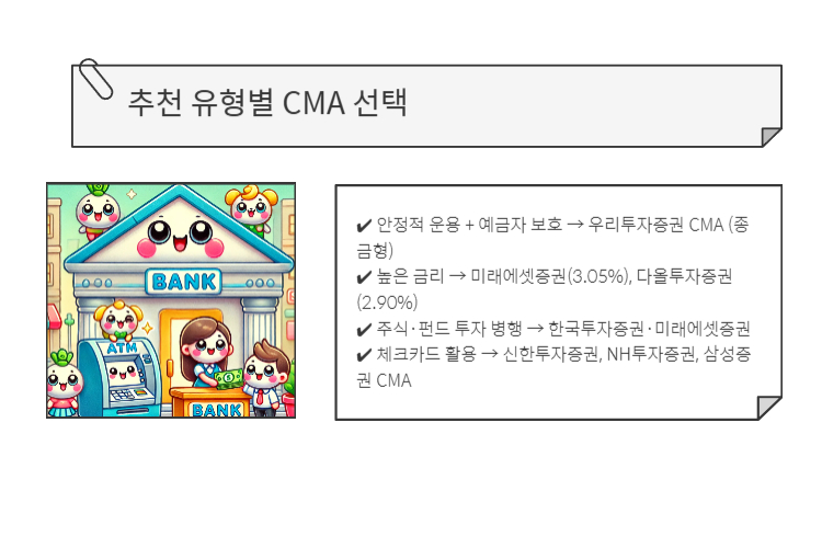 📢 CMA를 선택할 때는 금리뿐만 아니라, 예금자 보호 여부, 투자 위험도, 수수료 혜택 등을 종합적으로 고려하는 것이 중요하다.