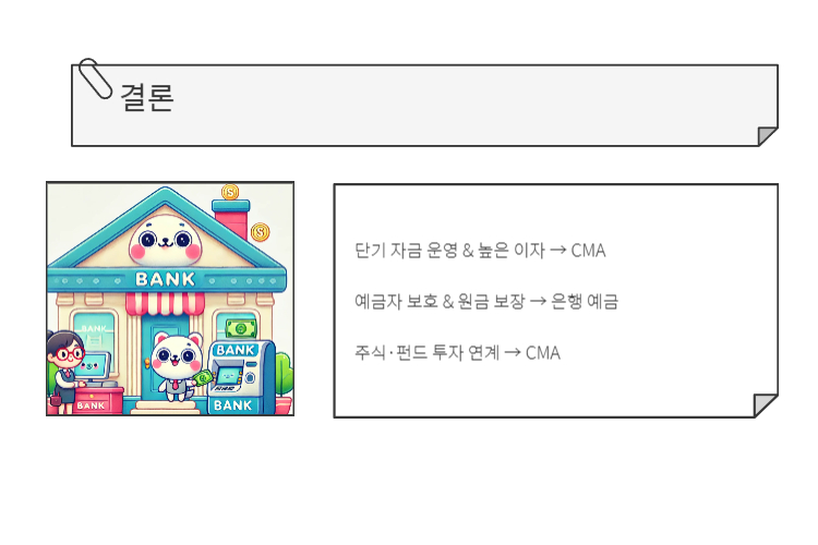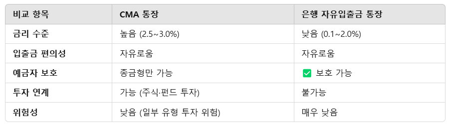 CMA는 은행의 자유입출금 통장보다 금리가 높고 입출금도 자유로워 단기 자금 관리에 유리하다. 하지만 은행 예금은 예금자 보호법 적용(5천만원 한도)을 받기 때문에 원금 보장을 원하는 경우 은행 예금이 더 안정적이다.