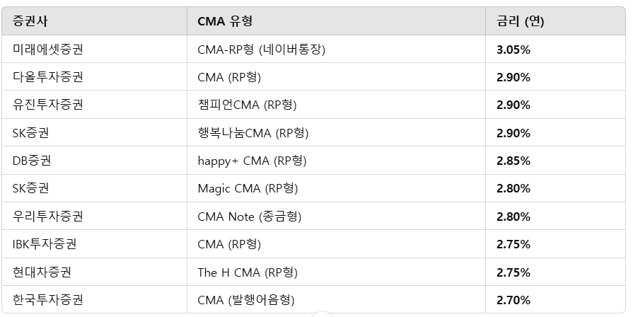 📢 금리 높은 순으로 보면 "미래에셋증권 네이버통장(3.05%)"이 가장 유리하며, 그다음으로 다올투자증권·유진투자증권·SK증권(2.90%)이 높은 금리를 제공하고 있다.