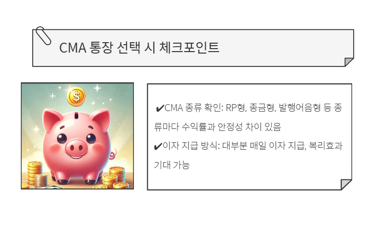 - CMA 종류 확인: RP형, 종금형, 발행어음형 등 종류마다 수익률과 안정성 차이 있음