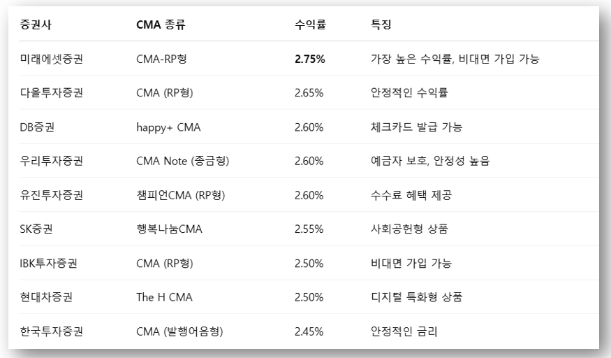 2025년 현재 기준, CMA 금리는 최대 2.75%까지 제공되고 있어 단기 자금을 운용하기에 매우 유리한 상황입니다. 특히 미래에셋증권, 다올투자증권, 우리투자증권은 수익률과 신뢰도 모두 높은 곳으로 추천드릴 수 있습니다.