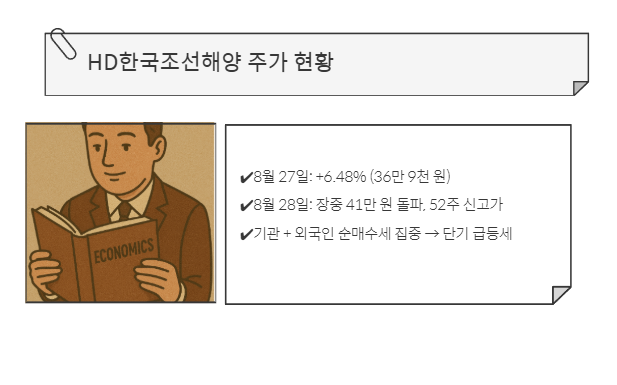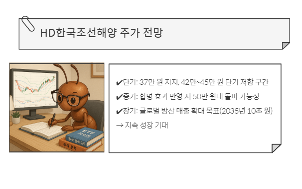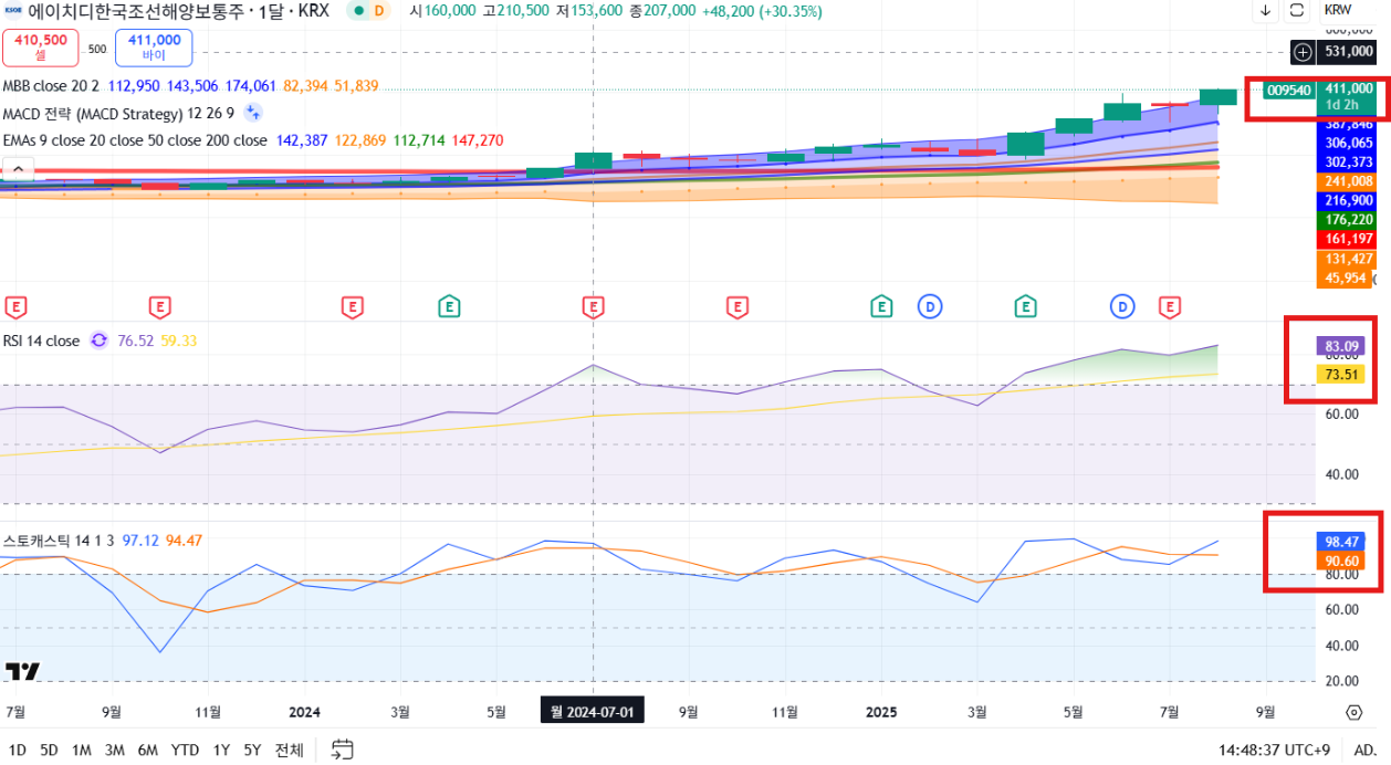 HD한국조선해양은 단기적으로 과열 신호가 있지만, 합병 모멘텀 + 글로벌 조선/방산 호황 + 실적 개선이라는 3박자가 맞아떨어지고 있습니다.