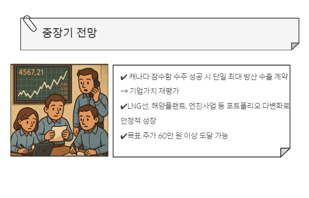 ✔️ 중장기: 잠수함 수주 시 60만 원 돌파 가능성 매우 높음
