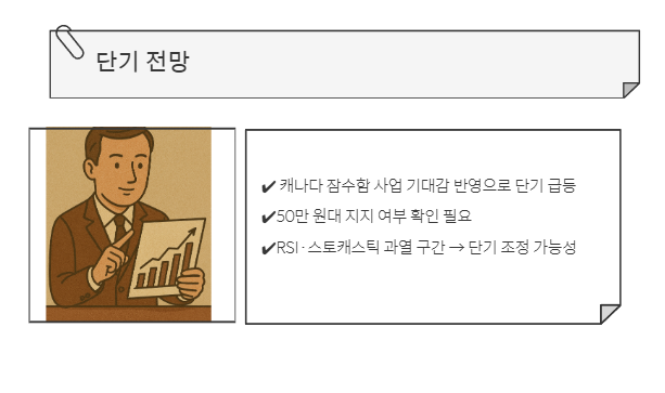 👉 단기적으로 과매수 구간에 접근했지만, 캐나다 잠수함 이슈로 추세는 상승세 유지 가능성이 큽니다.
