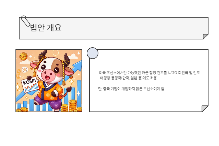• 기존에 미국 조선소에서만 가능했던 해군 함정 건조NATO 회원국 및 인도·태평양 동맹국(한국, 일본 등)에도 허용