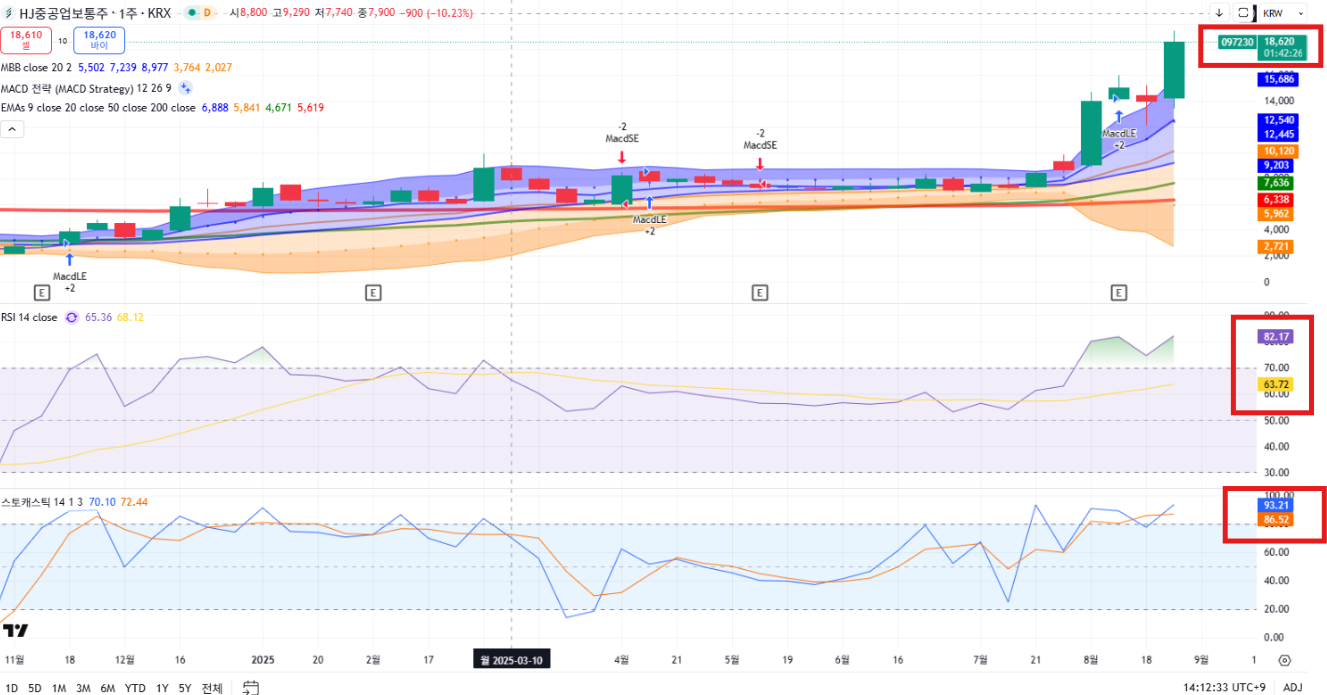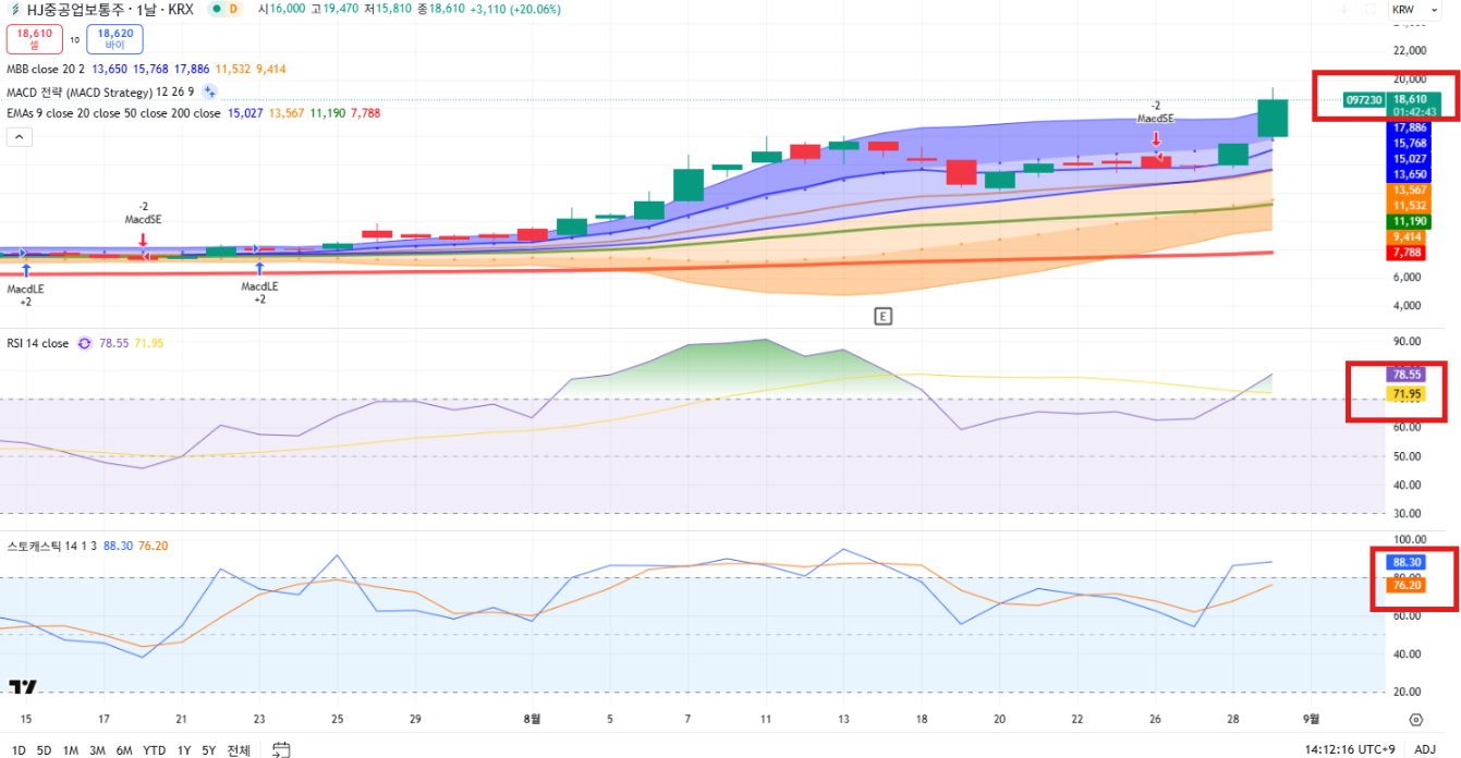 - RSI 78, 스토캐스틱 88 → 과매수 구간 진입