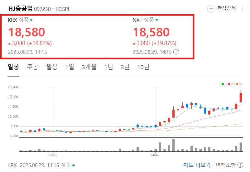 안녕하세요! 오늘의 급등주 소식입니다. 바로 HJ중공업인데요, 최근 조선업 훈풍이 기자재 기업으로까지 확산되며 상승세를 이어가고 있는데요, HJ중공업은 8.29 장중 +20% 이상 치솟으며 1만 8천 원대를 돌파했습니다. 이번 포스팅에서는 HJ중공업의 주가 현황, 급등 이유, 차트 분석, 수급 동향, 향후 전망을 종합적으로 살펴볼테니 투자에 참고바랍니다!