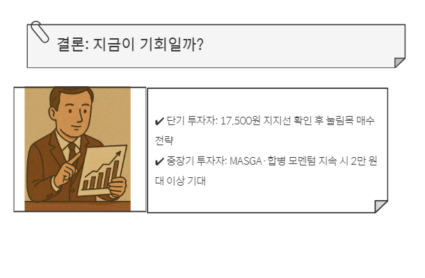 ✔️ 중장기 투자자: MASGA·합병 모멘텀 지속 시 2만 원대 이상 기대