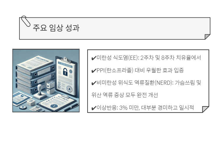• 미란성 식도염(EE): 2주차 및 8주차 치유율에서 PPI(란소프라졸) 대비 우월한 효과 입증