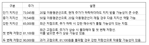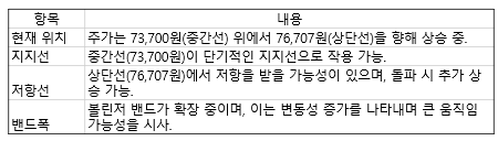 중간선(73,700원)이 단기적인 지지선으로 작용할 가능성이 높으며, 상단선(76,707원)에서 저항을 받을 가능성이 있습니다. 만약 상단선을 돌파한다면 추가 상승을 기대해봐도 좋습니다.