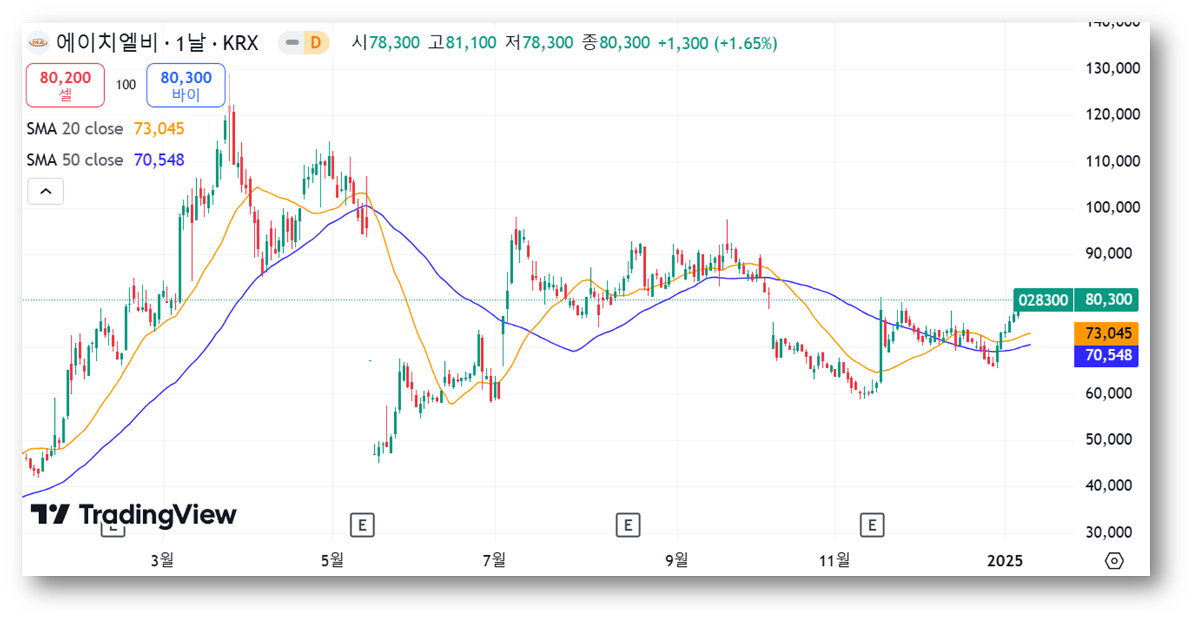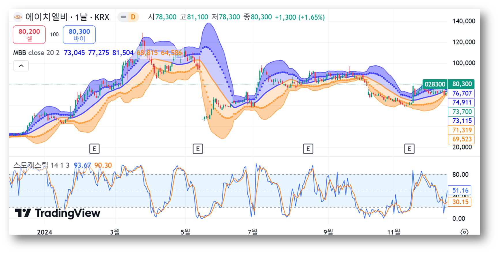 20일 이동평균선 (73,045원) 부근이 단기적 지지선 역할을 할 가능성이 큰데요, 현재 주가(80,300원)는 20일 이동평균선 위에 위치하고 있습니다. 주가가 하락하더라도 이 선에서 지지를 받을 가능성이 있습니다.