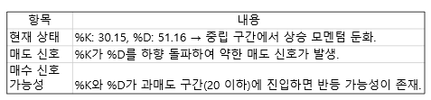 - %K (30.15), %D (51.16)로 스토캐스틱 지표는 현재 중립 구간인데요, 이는 단기적으로 상승 모멘텀이 둔화되었음을 의미하며, 과매도 구간(20 이하)에 가까워질 경우 반등 가능성이 생길 수 있습니다.