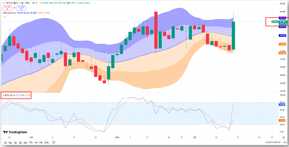• 주가가 상단선(82,458원)을 향해 돌파 중 → 강세장 진입 신호