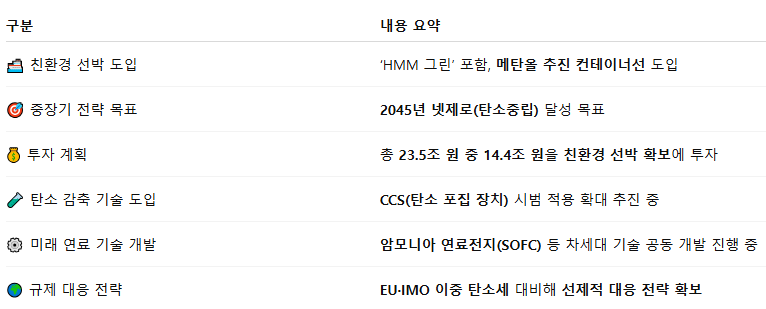 📌 결론: 탄소 규제 강화는 위기이자 기회. HMM은 이를 선제적으로 대응하며 글로벌 해운사 중 경쟁력 확보