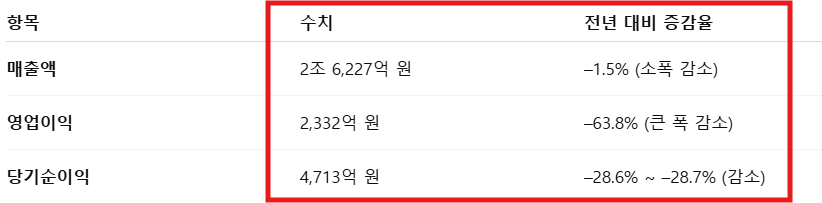 - HMM은 2025년 2분기 매출 2조 6,227억 원을 기록했으며, 영업이익은 2,332억 원으로 전년 동기 대비 39.6% 감소했습니다. 다만 당기순이익은 4,713억 원으로 18.1% 증가하며 선방했습니다. 원가 부담과 운임 변동성으로 영업이익은 줄었지만, 금융 수익과 환율 효과 등이 순이익 증가를 이끌었습니다.