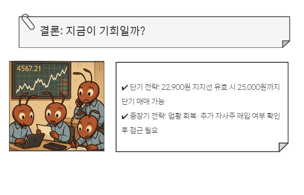 ✔️ 중장기 전략: 업황 회복·추가 자사주 매입 여부 확인 후 접근 필요