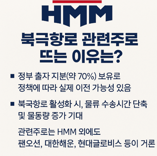 HMM은 단기적으로는 북극항로 관련 테마주, 장기적으로는 저평가된 우량 해운주로 투자 매력이 있습니다. 특히 자사주 매입 계획과 배당 지속성, 정부와 연계된 정책 수혜 가능성까지 고려할 때 중장기적으로 관심을 가질 만한 종목입니다.