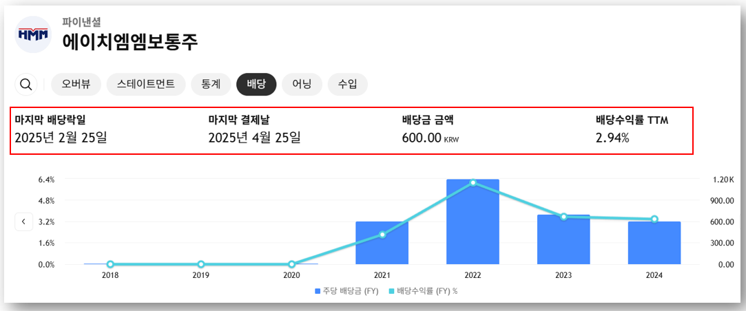 배당도 HMM의 투자 매력 중 하나입니다. 2025년 배당금은 주당 600원으로 확정되었으며, 배당락일은 2월 25일, 배당지급일은 4월 25일이었습니다.