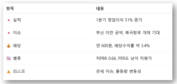 👉 해운 운임 하락과 관세 변수에도 불구하고 선대 확충과 영업 강화로 실적이 개선된 것이 강세의 배경입니다.