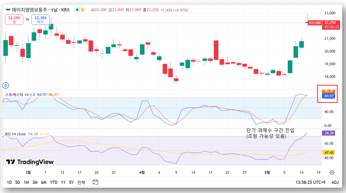 - RSI 74.39 / 스토캐스틱 84.97 → 단기 과매수 구간 진입