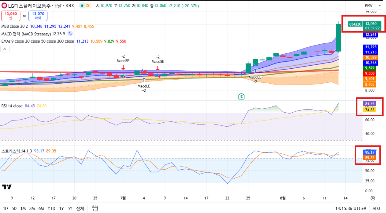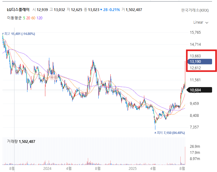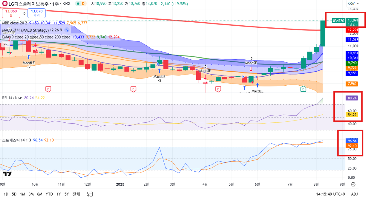 LG디스플레이는 이번 BOE 제재 소식으로 인한 반사이익 기대감과 외국인 강한 순매수가 맞물리며 주가가 급등했습니다. 단기 과열 구간에 진입했지만, 북미 시장 점유율 확대 가능성과 실적 개선 흐름이 이어진다면 중기적으로 15,000원 돌파 시나리오도 가능합니다.