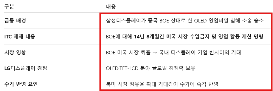 이번 급등의 배경에는 삼성디스플레이의 중국 BOE 상대로 한 OLED 영업비밀 침해 소송 승소가 있습니다. 미국 국제무역위원회(ITC)가 BOE에 대해 14년 8개월간 미국 시장 수입금지 및 영업 활동 제한 명령을 내리면서, 국내 디스플레이 기업들이 반사이익을 볼 것이라는 기대감이 커졌습니다.