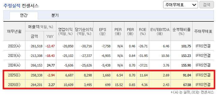 - 2025E 매출액: 25조 8,338억 원 (-2.94% YoY)