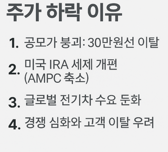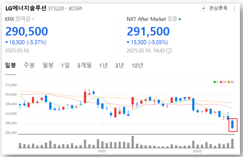 2025년 5월 16일, LG에너지솔루션 주가는 29만5000원까지 하락는데요, 2022년 상장 이후 처음으로 공모가(30만원)를 하회했습니다. 이는 투자 심리 위축의 결정적 신호로 해석됩니다.