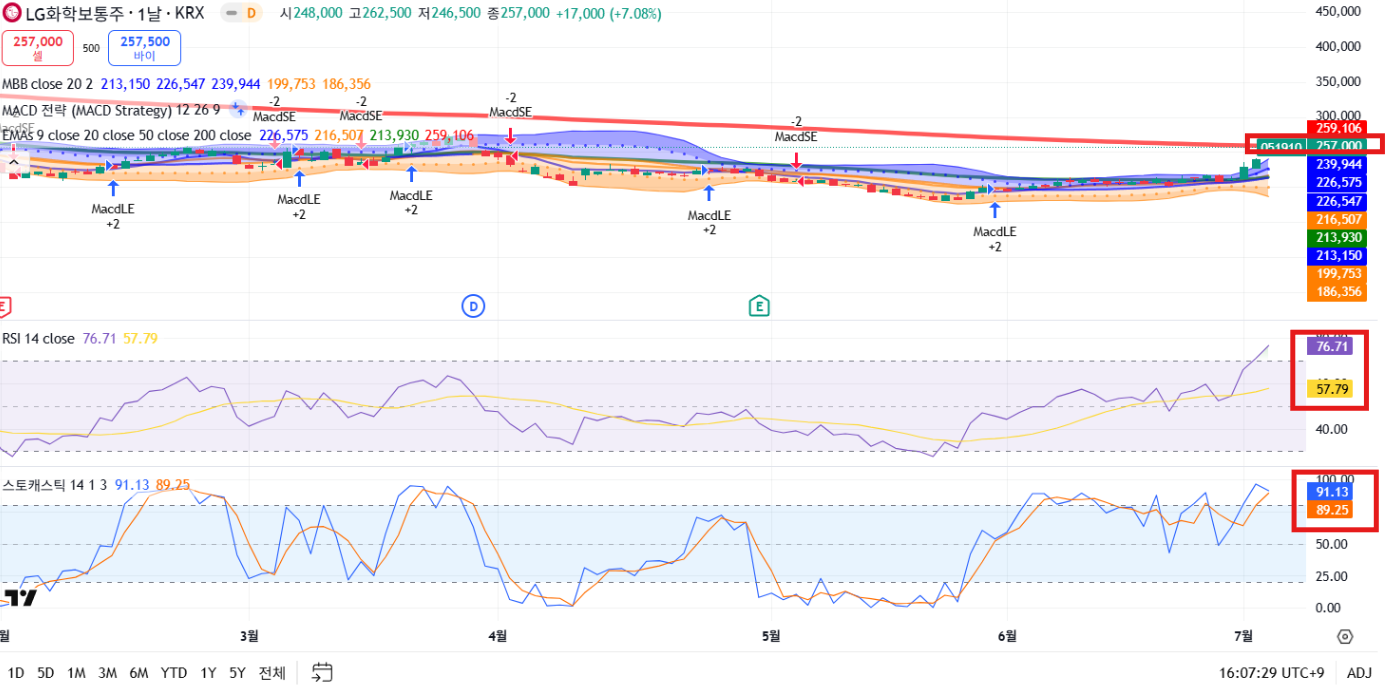 - RSI 71 / 스토캐스틱 88 → 고점 경계