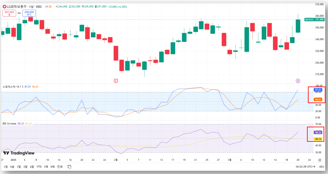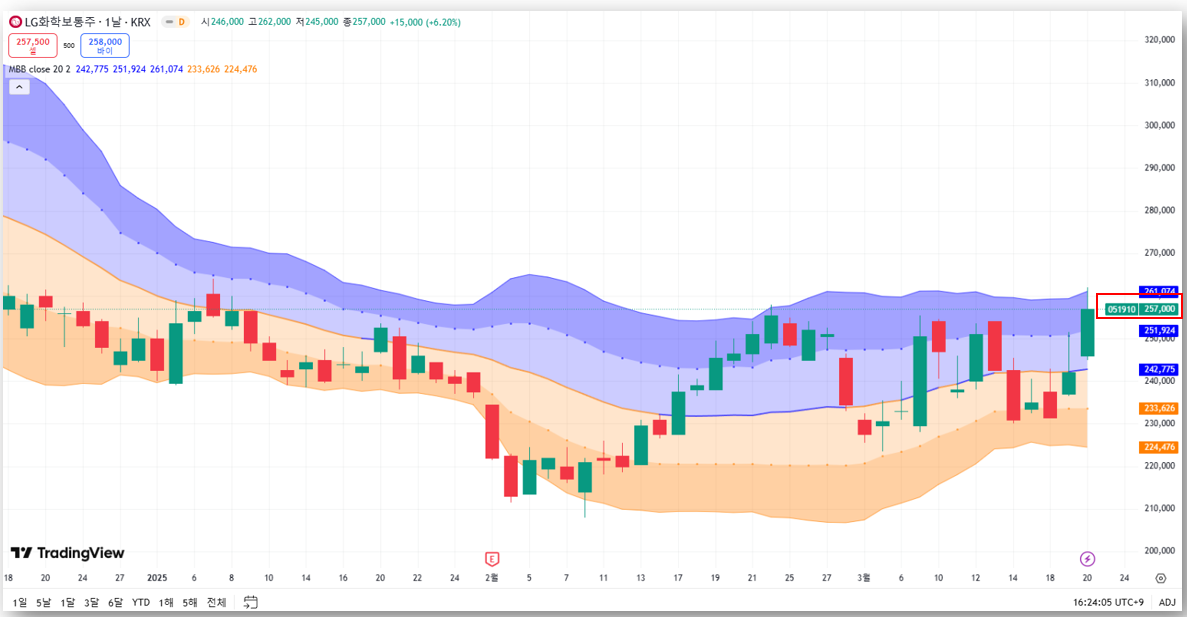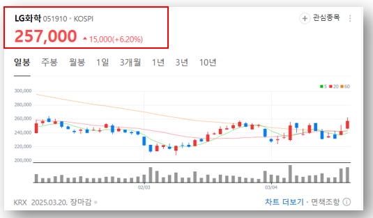 LG화학은 2025년 3월 20일 기준 257,000원으로 마감하며 전일 대비 6.20% 급등했습니다.