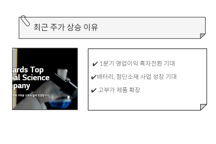 LG화학 주가가 최근 급등세를 보이며 투자자들의 관심이 집중되고 있습니다. 특히 1분기 영업이익 흑자전환 전망과 배터리, 첨단소재 부문의 성장 기대감이 상승 요인으로 작용하고 있습니다.