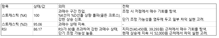 👉현재 스토캐스틱과 RSI 모두 과매수 구간에 위치하며, 단기 조정 가능성이 높다고 볼 수 있는데요. 단기 조정 시 지지선 근처(예: 40,450원, 39,293원)를 매수 기회로 볼 수 있으며, 현재 주가 상승세가 지속될 수 있지만, 과열 구간임을 고려해 52,000원 근처에서 일부 차익 실현을 고려할 수 있습니다.