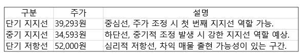 - 단기 지지선: 중심선인 39,293원이 첫 번째 지지선 역할을 할 가능성이 높은데요, 주가가 조정을 받을 경우, 이 가격대에서 지지를 확인해야 합니다.