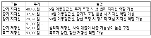 저항선은 현재 명확히 설정된 구간은 없지만, 심리적 저항선으로 51,000원 ~ 52,000원에서 차익 매물이 나올 가능성이 있으며, 목표가 상단인 53,000원이 강한 저항선으로 작용할 수 있습니다.