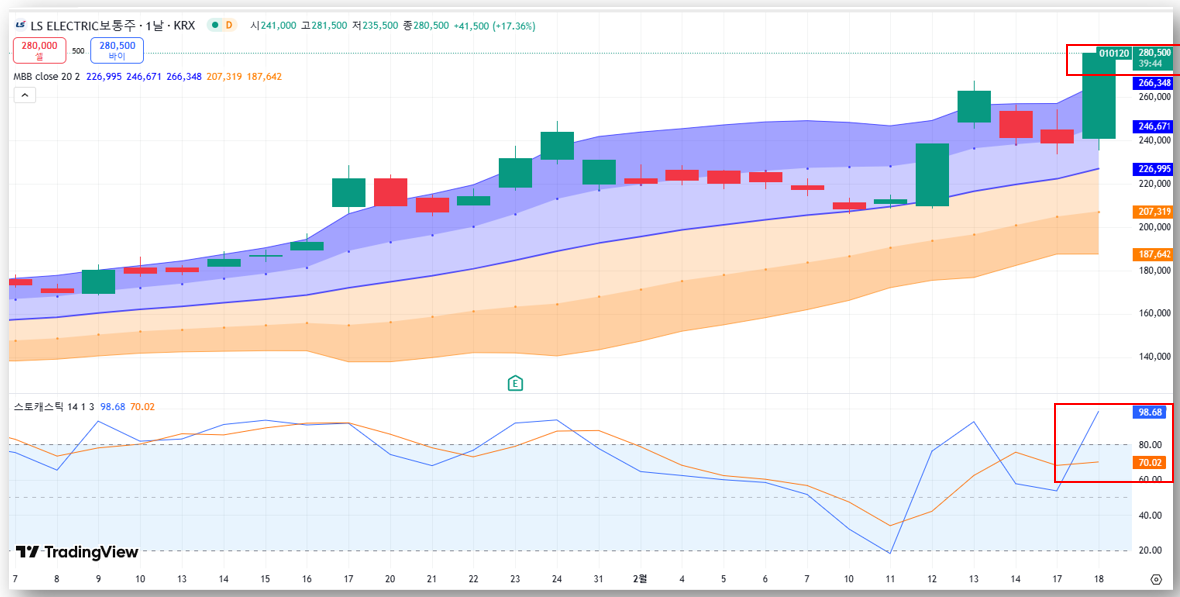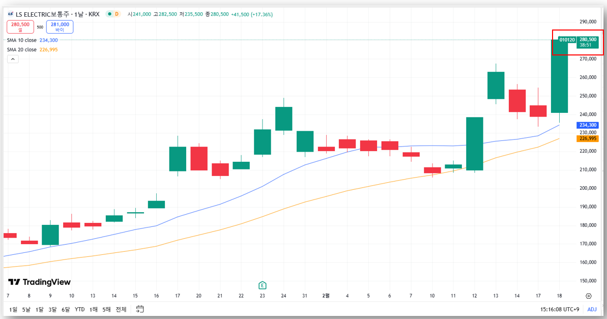 - LS ELECTRIC의 주가는 2025년 2월 18일 장중 한때 280,500원까지 상승하며 전일 대비 17.36% 상승했습니다.