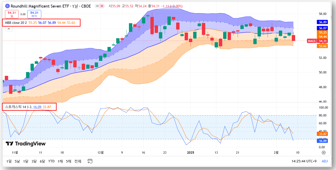 현재 MAGS ETF는조정 국면에 접어들었지만, 기술적 지표 상으로는 반등 가능성도 충분히 엿보이고 있습니다.
