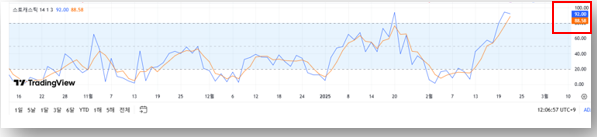 ⚠️ 스토캐스틱 과매수 구간, 단기 조정 가능