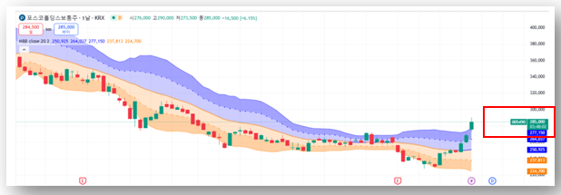 - 볼린저 밴드: 상단 돌파, 강한 상승 모멘텀 유지