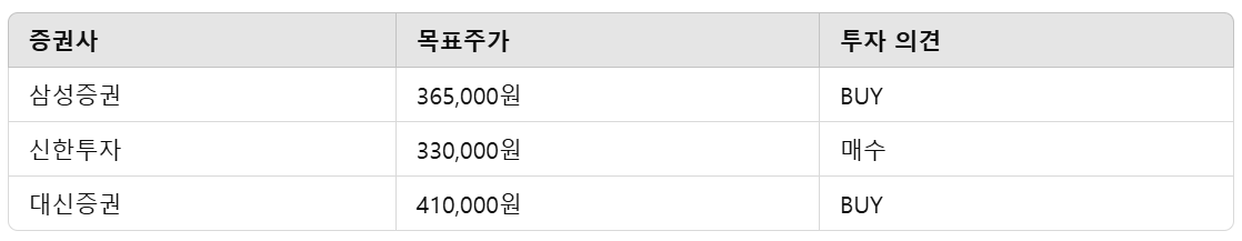 - 애널리스트 목표주가 평균: 365,500원 (+28.27%)