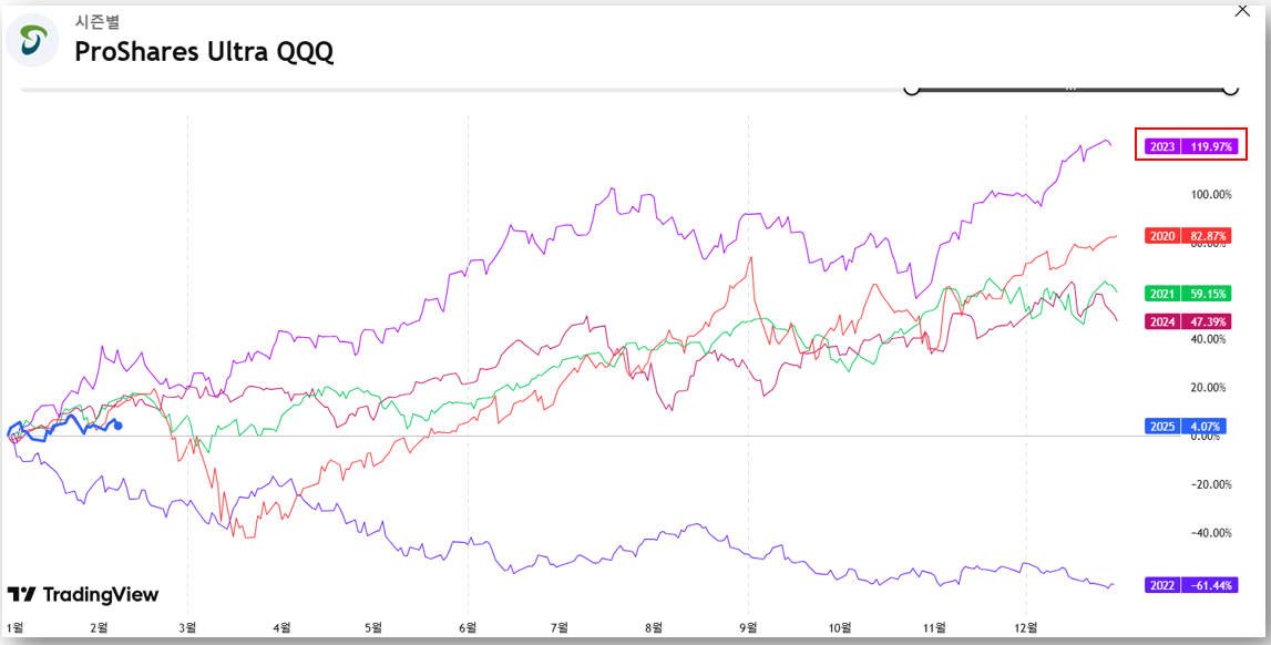 아래 차트는 QLD의 시즌별 성과를 나타내는데요. 특히 2023년에는 +119.97%라는 놀라운 성장을 기록했으며, 나스닥 기술주 상승장이 ETF 수익률에 크게 기여했습니다.
