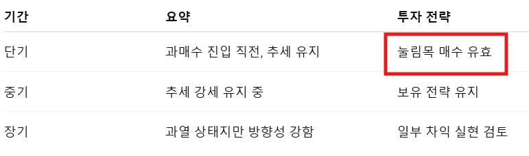 - 기술적 분석: 중장기 강세 지속, 단기 조정 가능성 있음