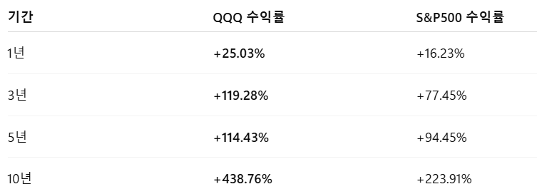 QQQ는 기술주 중심의 ETF답게 S&P500 대비 높은 수익률을 꾸준히 보여주고 있습니다.